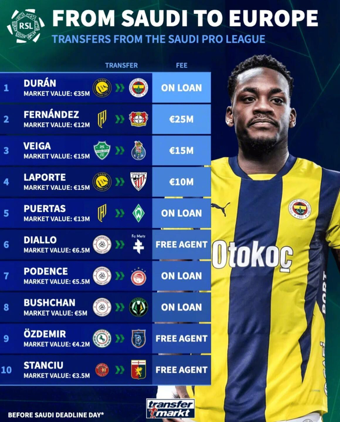 1. 杜兰(利雅得胜利->费内巴切):身价3500万欧;租借