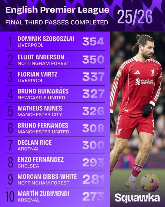 本赛季英超进攻三区成功传球榜:
