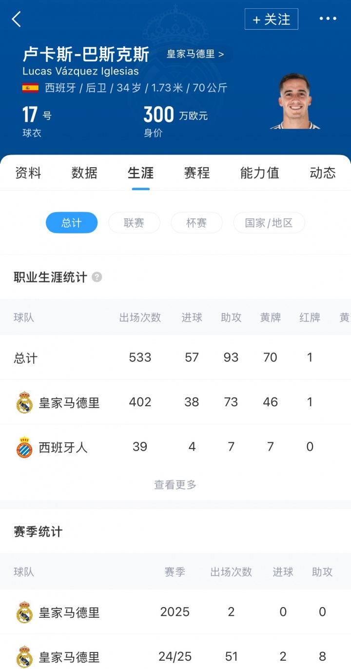 迄今为止,巴斯克斯为皇马出战402场比赛,打入38球。巴斯克斯本月初刚刚度过自己的34岁生日,他16岁加盟皇马青年队,至今已为球队效力18年。